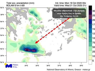 Σύμφωνα με τα προγνωστικά στοιχεία του Εθνικού Αστεροσκοπείου Αθηνών/meteo.gr, το βαρομετρικό χαμηλό που θα σχηματιστεί σήμερα (19.10.2020) στην Ανατολική Μεσόγειο, αναμένεται τις επόμενες ημέρες να επεκταθεί μέχρι την περιοχή των Δωδεκανήσων.