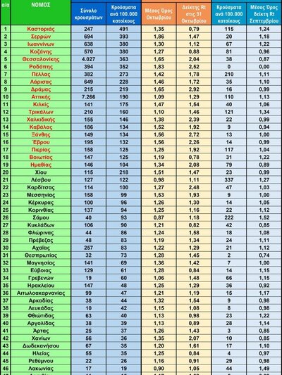 Στον παρακάτω πίνακα αποτυπώνονται το σύνολο των κρουσμάτων, τα κρούσματα ανά 100.000 κατοίκους, ο δείκτης μεταδοτικότητας Rt στις 31 Οκτωβρίου και ο μέσος όρος του τον Οκτώβριο, ανά νομό της χώρας μας. Γίνεται επίσης σύγκριση με τα αντίστοιχα στοιχεία του Σεπτεμβρίου.
