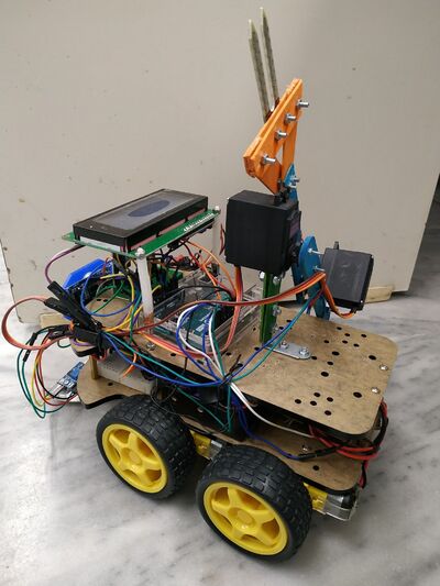 Τι είναι το Agruino; Το Agruino είναι μια κινητή πλατφόρμα Arduino εφοδιασμένη με αισθητήρες που κινείται στον υποδεδειγμένο χώρο και παίρνει μετρήσεις Θερμοκρασίας, Υγρασίας ατμόσφαιρας και Υγρασίας Εδάφους. Οι μετρήσεις αυτές τυγχάνουν επεξεργασίας από τη φορητή πλατφόρμα και σε πρώτο στάδιο - εφόσον κρίνεται απαραίτητο - ενημερώνει για την αναγκαιότητα ενεργοποίησης του αυτόματου ποτίσματος ένα υπάρχει ξηρασία ή ενεργοποιεί την υδρονέφωση εφόσον πρόκειται να επικρατήσουν συνθήκες δημιουργίας παγετού. Η πλατφόρμα όταν δεν παίρνει μετρήσεις θα βρίσκεται προστατευμένη σε ειδικά διαμορφωμένο χώρο από καιρικά φαινόμενα (π.χ. καταιγίδες, πλημμύρες) και οι αισθητήρες θα έχουν αυξημένη διάρκεια ζωής (μικρότερο κόστος).