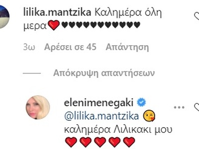 Η παρουσιάστρια που είναι γνωστό ότι διαθέτει άριστη σχέση μαζί της δε θα μπορούσε να αφήσει αυτό το σχόλιο αναπάντητο για αυτό έγραψε με τη σειρά της, “καλημέρα Λιλικάκι μου” προσθέτοντας κι εκείνη με τη σειρά της μερικές καρδιές.