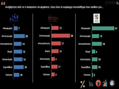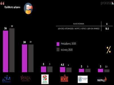 Η παραπάνω αρνητική αξιολόγηση καταγράφεται και στην πρόθεση ψήφου, όπου η Νέα Δημοκρατία σημειώνει πτώση 2% σε σχέση με την προηγούμενη μέτρηση της Prorata. Ωστόσο, οι αρνητικές επιδόσεις της κυβέρνησης δεν μπορούν να αμφισβητήσουν την κυριαρχία της ΝΔ στο πλαίσιο του κομματικού ανταγωνισμού, καθώς καμία άλλη πολιτική δύναμη δεν καταγράφει σημαντικά θετικές μεταβολές αλλά ούτε και θετικότερο ισοζύγιο συναισθημάτων προς την ίδια, συγκριτικά με το κυβερνόν κόμμα.
