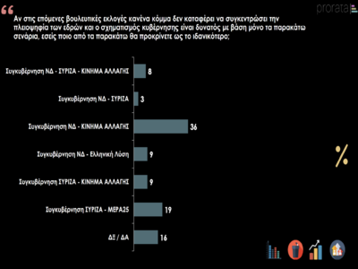Σε περίπτωση που διεξάγονταν αύριο εκλογές και δεν υπήρχε δυνατότητα σχηματισμού αυτοδύναμης κυβέρνησης, τα σενάρια συγκυβέρνησης που προκρίνονται επί του συνολικού δείγματος της έρευνας είναι πρώτον η συνεργασία ΝΔ - Κινήματος Αλλαγής (36%) και δεύτερον η συνεργασία ΣΥΡΙΖΑ - ΜεΡΑ 25 (19%). Το σενάριο που προκρίνουν οι ψηφοφόροι της ΝΔ, του Κινήματος Αλλαγής αλλά και όσοι αυτοτοποθετούνται στα δεξιά και το κέντρο του πολιτικού φάσματος είναι μια συγκυβέρνηση μεταξύ των δύο παραπάνω κομμάτων, ενώ οι ψηφοφόροι του ΣΥΡΙΖΑ, καθώς και όσοι αυτοτοποθετούνται στα αριστερά του πολιτικού φάσματος ή θεωρούν καταλληλότερο ως πρωθυπουργό τον Αλέξη Τσίπρα προκρίνουν μια ενδεχόμενη συγκυβέρνηση με το ΜεΡΑ 25.