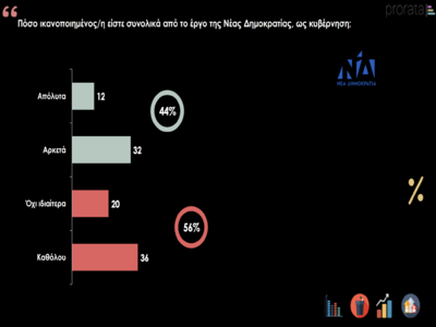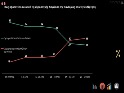 Aρνητικά αξιολογεί το 55% των ερωτηθέντων, τη διαχείριση της πανδημίας από την κυβέρνηση, στην έρευνα που διεξήγαγε η PRORATA. Σύμφωνα με τα ευρήματα της έρευνας, η συνολική ικανοποίηση των πολιτών από το κυβερνητικό έργο αλλά και από τη διαχείριση της πανδημίας σε υγειονομικό και οικονομικό επίπεδο καταγράφεται χαμηλή, λαμβάνοντας ολοένα και αρνητικότερο πρόσημο κατά τη διάρκεια των τελευταίων μηνών.