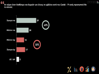 Τέλος, το 32% της κοινής γνώμης δηλώνει πως ακόμα και αν το εμβόλιο κατά του Covid - 19 ήταν αύριο διαθέσιμο και δωρεάν για όλους/ες δεν θα το έκανε, ενώ η πλειοψηφία (63%) δηλώνει πως θα το έκανε.