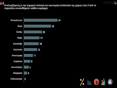 Πιο συγκεκριμένα, το 56% των συμμετεχόντων δηλώνουν όχι ιδιαίτερα ή καθόλου ικανοποιημένοι από το κυβερνητικό έργο, με την ικανοποίηση να είναι σημαντικά μικρότερη μεταξύ των ατόμων που διαμένουν σε νοικοκυριά με χαμηλότερα εισοδήματα και σημαντικά υψηλότερη μεταξύ των ατόμων που ενημερώνονται σε καθημερινή βάση για τις εξελίξεις από την τηλεόραση. Τα κυρίαρχα συναισθήματα που νιώθουν οι συμμετέχοντες, αναλογιζόμενοι την οικονομική και πολιτική κατάσταση της χώρας είναι η απογοήτευση και ο θυμός, με τα αρνητικά συναισθήματα να είναι αθροιστικά πολλαπλάσια σε σχέση με τα θετικά.