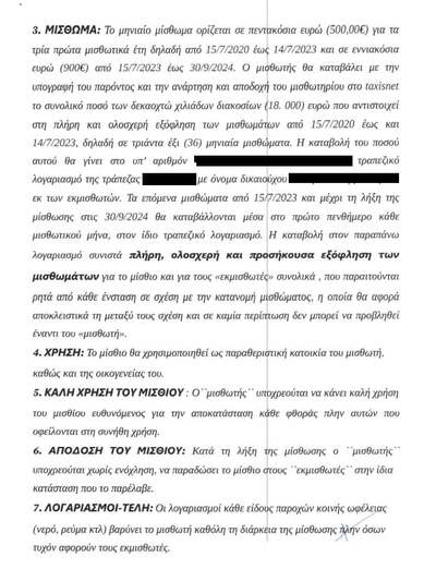 2) Τον Ιούνιο του τρέχοντος έτους υπέγραψα τετραετές μισθωτήριο συμφωνητικό εξοχικής κατοικίας 71 τ.μ. στη περιοχή της Λαυρεωτικής, με αντίστοιχο εμβαδό υπόγειου και με μίσθωμα 500 ευρώ μηνιαίως για τα πρώτα τρία χρόνια και 900 ευρώ μηνιαίως για τον τέταρτο χρόνο. Η συμφωνία περιελάμβανε την προκαταβολική κατάθεση σε τραπεζικό λογαριασμό των μισθωμάτων των τριών πρώτων χρόνων, η οποία και έγινε σε λογαριασμό της ALPHA BANK στις 4 Ιουλίου 2020. Το δε συμφωνητικό κατατέθηκε στην εφορία στις 2 Ιουλίου 2020.