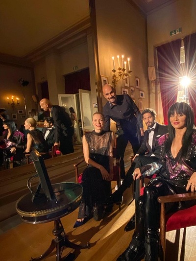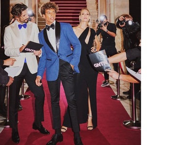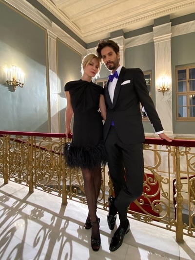 -Πρώτη εμφάνιση με ανδρόγυνο, βραδινό κοστούμι Louis Vuitton με μεταλική λεπτομέρεια. Συνδυάστηκε με μυτερές γόβες Migato