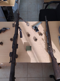 Τα κατασχεμένα όπλα και φυσίγγια, κατασχέθηκαν και θα αποσταλούν στο Τμήμα Εργαστηρίων Πυροβόλων Όπλων και Ιχνών Εργαλείων της Διεύθυνσης Εγκληματολογικών Ερευνών για περαιτέρω εργαστηριακές εξετάσεις. Ο συλληφθείς θα οδηγηθεί στον Εισαγγελέα Πρωτοδικών Πατρών".