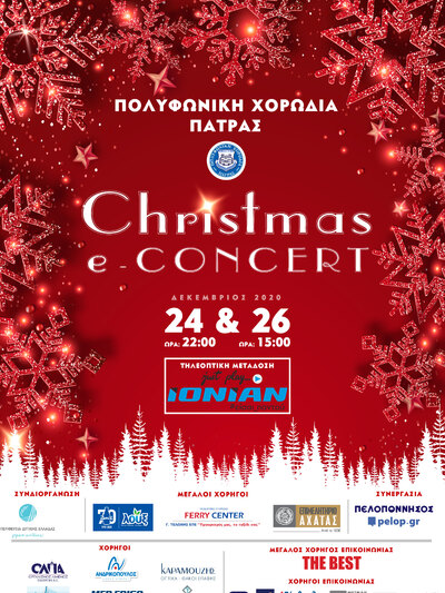 «Christmas e-Concert 2020», που θα προβληθεί από τον τηλεοπτικό σταθμό της Δυτικής Ελλάδος: IONIAN TV και που θα περιλαμβάνει ένα απάνθισμα, από αναδρομικές ερμηνείες των Χριστουγεννιάτικων Κοντσέρτων της τελευταίας πενταετίας.
