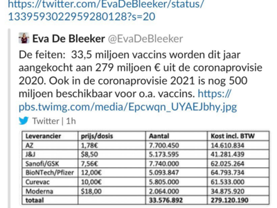 Ωστόσο, όπως αναφέρει το Politico, η υφυπουργός Υφυπουργός Προϋπολογισμού του Βελγίου, Εύα Ντε Μπλέκερ, ανάρτησε την Πέμπτη στο twitter, έναν πίνακα με τις τιμές όλων των εμβολίων που αγόρασε η ΕΕ αλλά και τα ποσά που θα δαπανήσει η βελγική κυβέρνηση. Παρά το γεγονός ότι η ανάρτηση γρήγορα διεγράφη, το ιστότοπος HLN δημοσίευσε ένα screenshot.