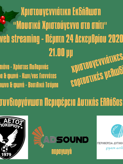 Η Περιφέρεια Δυτικής Ελλάδας και ο Αθλητικός Όμιλος Αλποχωρίου διοργανώνουν διαδικτυακή - ψηφιακή μουσική εκδήλωση με τίτλο: «Μουσικά Χριστούγεννα στο σπίτι» η οποία θα μεταδοθεί σε ζωντανή μετάδοση σήμερα, Πέμπτη 24 Δεκεμβρίου, στις 9 το βράδυ, από το YouTube.