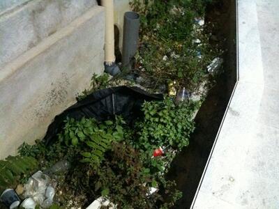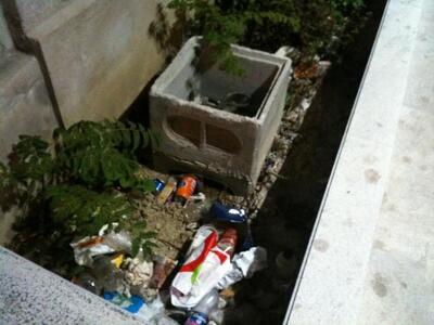 Τα παρτέρια αντί φυτών έχουν κάθε είδους σκουπίδια, από ομπρέλες μέχρι κουτιά αναψυκτικών.