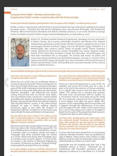 Συνέντευξη του διακεκριμένου Πατρινου ποιητή Αντώνη Σκιαθά φιλοξενεί το περιοδικό της Greek Embassy in London. Η συνέντευξη στο έγκριτο περιοδικό φιλοξενείται στις σελίδες 14 και 15 και ο Αντώνης Σκιαθάς αναλύει τις απόψεις του για την τέχνη, τον πολιτισμό και φυσικά την ποίηση. Είναι και αυτή άλλη μια σημαντική αναγνώριση του έργου του εκτός των συνόρων.