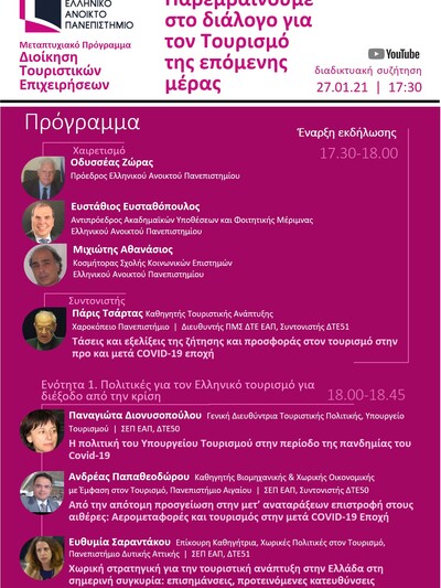 Το Ελληνικό Ανοικτό Πανεπιστήμιο και το Μεταπτυχιακό Πρόγραμμα στη Διοίκηση Τουριστικών Επιχειρήσεων (ΜΠΣ ΔΤΕ) σας προσκαλούν στη δημόσια διαδικτυακή συζήτηση για το σήμερα, το αύριο και το μετά του Ελληνικού Τουρισμού την Τετάρτη 27-01-2021 στις 17.30 στο κανάλι του ΕΑΠ στο YouTube, στο σύνδεσμο: https://youtu.be/WqIlSmd4DnM.