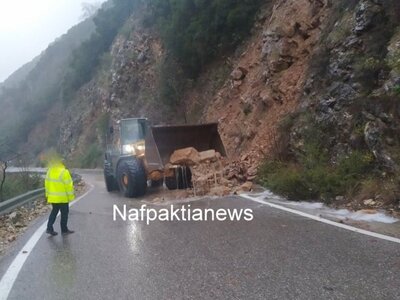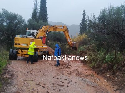 Μηχανήματα του Δήμου Ναυπάκτου επιχειρούν να αποκαταστήσουν την κυκλοφορία στα σημεία που έχει διακοπεί.