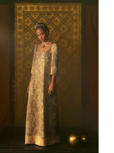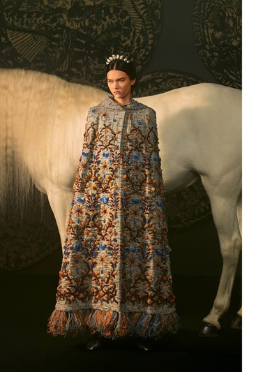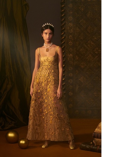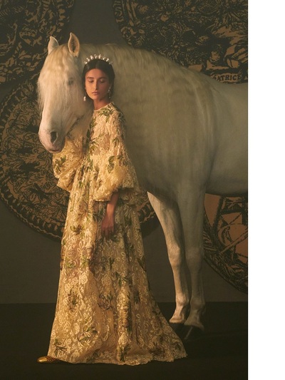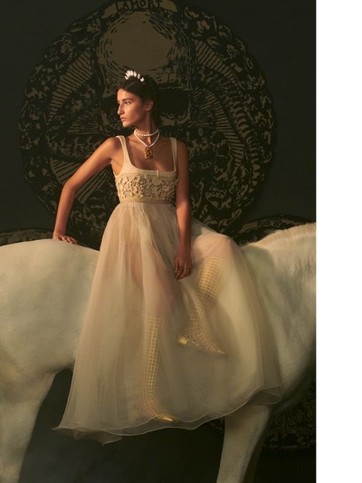 Με έμπνευση τις εικονογραφημένες κάρτες ταρώ, η Maria Grazia Chiuri βασίστηκε σε χαρακτήρες και σύμβολα της εν λόγω τράπουλας δημιουργώντας ακόμα μια φορά παραμυθένια ρούχα από απίθανα ρομαντικά μπροκάρ, ντεβορέ βελούδο, lamé σενίλ, ζακάρ μεταξωτά και δαντέλα κιπούρ. Η συλλογή αναδείχθηκε με φωτογράφηση και 15λεπτη ταινία μικρού μήκους, η οποία γυρίστηκε στο Castello di Sammezzano στην Τοσκάνη με τη σφραγίδα του Matteo Garrone. Το φιλμάκι αρχίζει με μια νεαρή γυναίκα που κάθεται για μια ταρώ ανάγνωση με ένα κλασικό Dior Bar Jacket, προτού κάνει ένα εγκεφαλικό ταξίδι αυτογνωσίας μέσα από τις αίθουσες arabesque, σμίγοντας με ταρώ ηρωίδες. Eδώ ακριβώς παρακολουθούμε την ελληνίδα καλλονή.