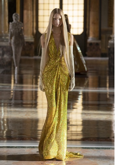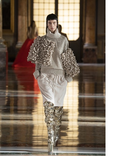 Ο Giambattista Valli αντίθετα δεν κάνει εκπτώσεις στο όραμα της couture. Eπιμένει πως το εκτόπισμα με τα φουντωτά τούλια, τα ολομέταξα μπαλούν, τις άνθινες περικοκλάδες και τον άκρατο ρομαντισμό αποτελεί αποστολή του καιθώς μόνο τέτοια στοιχεία υπηρετούν τη «τεατράλε» πλευρά της μόδας. Σύγχρονες μαρκησίες λοιπόν για μεγαλοπρεπές red carpet κόντρα στον covid.