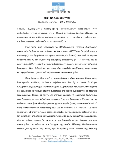 «Είναι οξύμωρο να αξιώνεται από τους ενδιαφερόμενους να επικαλούνται τη νομολογία, χωρίς να τους παρέχεται η πρακτική δυνατότητα να την γνωρίζουν», υποστηρίζει η Βουλευτής Αχαΐας.