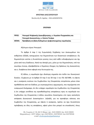 Η ερώτηση απευθύνεται προς τους Υπουργούς, Δικαιοσύνης Κώστα Τσιάρα και Ψηφιακής Διακυβέρνησης Κυριάκο Πιερρακάκη και αφορά σε πάγιο αίτημα των δικηγορικών συλλόγων ανά την Ελλάδα για τη δυνατότητα πρόσβασης των μελών τους σε βάση δεδομένων ψηφιοποιημένης νομολογίας.
