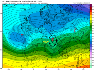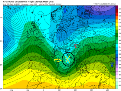 Από την Παρασκευή 12/2 η ατμοσφαιρική κυκλοφορία θα αρχίσει να μεταπίπτει σε μεσημβρινή (κινήσεις από τα βόρεια προς τα νότια). Χαρακτηριστική εξέλιξη αυτής της αλλαγής η ανύψωση του Αζορικού αντικυκλώνα προς την Μ. Βρετανία και την Σκανδιναβία, γεγονός που θα προκαλέσει την διάσπαση του πολικού στροβίλου, εξαναγκάζοντας τμήμα του να κινηθεί προς τα νότια. Έτσι λοιπόν, αέριες μάζες πολικής προέλευσης από την περιοχή της δυτικής Ρωσίας – ανατολικής Σκανδιναβίας θα ξεχυθούν προς την Βαλκανική χερσόνησο.