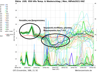 Χαρακτηριστικό το παρακάτω διάγραμμα ensemble για την πόλη της Πάτρας όπου διακρίνεται η μετάβαση από το φθινόπωρο στον χειμώνα με τις μέγιστες θερμοκρασίες από τις 14 έως 18 του μήνα να μην ξεπερνούν τους 7-9oC.