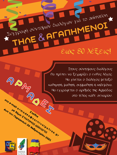 Η Κοινωφελής Επιχείρηση Δήμου Πατρέων – Καρναβάλι Πάτρας καλεί τις Αρμάδες όλων των ηλικιακών κατηγοριών να συμμετάσχουν στη συγγραφή σύντομων χιουμοριστικών διαλόγων που θα περιγράφουν όσα απρόοπτα συνέβησαν κατά τη διάρκεια της τηλεκπαίδευσης. Οι διάλογοι που θα αποσταλούν θα συνδεθούν στο animation, με τίτλο «Τηλέ... κι αγαπημένοι!».