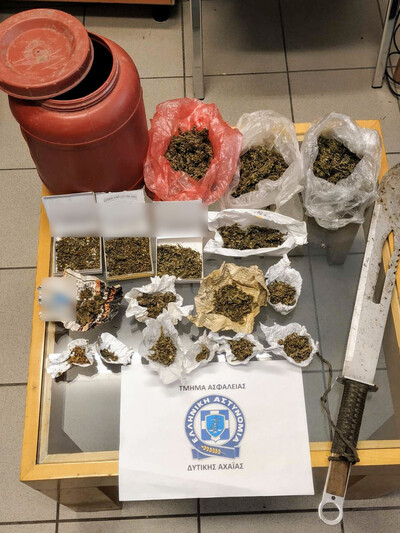 Ειδικότερα, οι αστυνομικοί του Τμήματος Ασφαλείας Δυτικής Αχαΐας, στο πλαίσιο αξιοποίησης πληροφοριών, πραγματοποίησαν έρευνα στην οικία του δράστη, κατά την οποία βρήκαν και κατέσχεσαν επτά συσκευασίες, με κάνναβη, συνολικού βάρους (23,3) γραμμαρίων και ένα ξίφος.