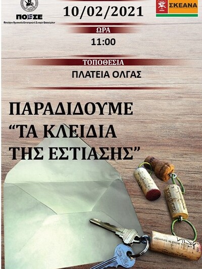 Η συμβολική διαμαρτυρία- παράδοση των κλειδιών, θα διεξαχθεί, αύριο, Τετάρτη, 10/2/2021, στις 11:00 στην Πλατεία Όλγας".