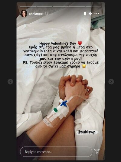 "Happy Valentine’s day. Εμάς σήμερα μας βρήκε η μέρα στο νοσοκομείο (όλα είναι καλά και περαστικά ευτυχώς) και σας στέλνουμε τις ευχές μας και την αγάπη μας. Υ.Γ. Τουλάχιστον βρήκαμε τρόπο να βγούμε από το σπίτι μας σήμερα", έγραψε η ίδια.