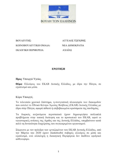 Στο πλαίσιο του κοινοβουλευτικού ελέγχου, ο βουλευτής Αχαΐας της Νέας Δημοκρατίας Άγγελος Τσιγκρής κατέθεσε ερώτηση προς τον Υπουργό Υγείας με την οποία ζητάει την ενίσχυση -με εξοπλισμό και μέσα- του ΕΚΑΒ Δυτικής Ελλάδας, με έδρα την Πάτρα.