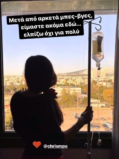 Ο παρουσιαστής του ΑΝΤ1 φωτογράφισε την σύζυγό του στο δωμάτιο του νοσοκομείου με τον ορό στο χέρι και έγραψε: «Μετά από αρκετά μπες – βγες, είμαστε ακόμα εδώ… ελπίζω όχι για πολύ.»