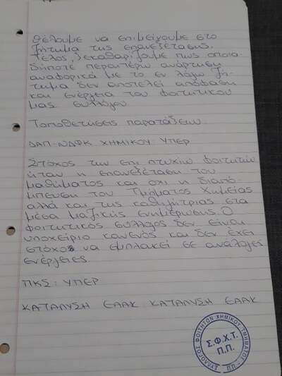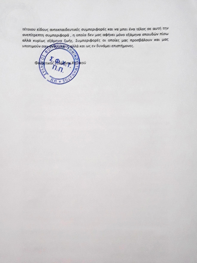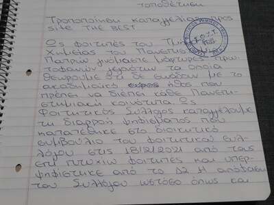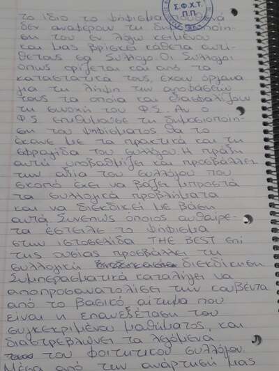 «Ως Φοιτητικός Σύλλογος καταγγέλλουμε τη διαρροή ψηφίσματος που κατατέθηκε στο διοικητικό συμβούλιο του συλλόγου στις 18/2. Το ψήφισμα αυτό που κατατέθηκε από τους επί πτυχίο φοιτητές υπερψηφίστηκε από το διοικητικό συμβούλιο. Η απόφαση του συλλόγου ωστόσο όπως και το ίδιο το ψήφισμα πουθενά δεν αναφέρουν την δημοσιοποίηση του εν λόγω κειμένου και μας βρίσκει ξεκάθαρα αντίθετους σα Σύλλογο. Οι Σύλλογοι όπως ορίζεται και από τα καταστατικά τους, έχουν όργανα για τη λήψη των αποφάσεων τους τα οποία και εξασφαλίζουν τη συνοχή του φοιτητικού συλλόγου. Αν ο Φοιτητικός Σύλλογος επιθυμούσε να προβεί σε δημοσιοποίηση του συγκεκριμένου ψηφίσματος θα το έκανε με τα πρακτικά και τη σφραγίδα του συλλόγου. Η πράξη αυτή, υποβαθμίζει και προσβάλει την αξία του Συλλόγου που σκοπό έχει να βάζει μπροστά τα συλλογικά προβλήματα και να διεκδικεί με βάση αυτά. Συνεπώς οποίος αυθαίρετα έστειλε το ψήφισμα στην ιστοσελίδα THE BEST επί της ουσίας προσβάλει τη συλλογική διεκδίκηση. Καταλήγει να αποπροσανατολίζεται η κουβέντα από το βασικό αίτημα που είναι η επανεξέταση του συγκεκριμένου μαθήματος και εμείς θέλουμε και μέσα από αυτή την ανάρτηση να επιμείνουμε σε αυτό. Τέλος, ξεκαθαρίζουμε πως οποιαδήποτε περαιτέρω ανάρτηση αναφορικά με το εν λόγω ζήτημα δεν αποτελεί απόφαση και ενέργεια του φοιτητικού μας συλλόγου. Παρακάτω επισυνάπτονται τα πρακτικά από τη συνεδρίαση του ΔΣ σήμερα αναφορικά με το συμβάν καθώς και η απόφαση του συλλόγου για την οποία γίνεται λόγος».
