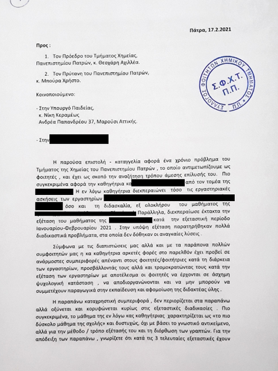 Ο φοιτητικός Σύλλογος του Tμήματος Χημείας του Πανεπιστημίου της Πάτρας καταγγέλλει τη διαρροή προς τα ΜΜΕ (το θέμα έφερε στο φως το thebest.gr) του ψηφίσματός του για την καθηγήτρια του Τμήματος και τα προβλήματα που έχουν ανακύψει σε σχέση με το μάθημά της. Συγκεκριμένα σε ανακοίνωσή του ο Σύλλογος αναφέρει: