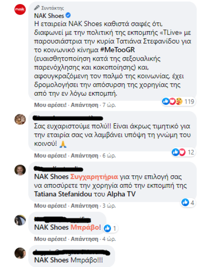 Χαρακτηριστικά η εταιρεία αναφέρει πως «Η εταιρεία NAK Shoes καθιστά σαφές ότι, διαφωνεί με την πολιτική της εκπομπής «ΤLive» με παρουσιάστρια την κυρία Τατιάνα Στεφανίδου για το κοινωνικό κίνημα #MeTooGR (ευαισθητοποίηση κατά της σεξουαλικής παρενόχλησης και κακοποίησης) και, αφουγκραζόμενη τον παλμό της κοινωνίας, έχει δρομολογήσει την απόσυρση της χορηγίας της από την εν λόγω εκπομπή.».