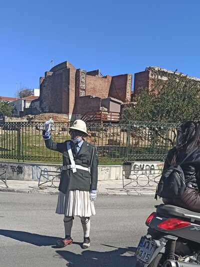Τροχονόμος τσολιάς ρυθμίζει τη κυκλοφορία στην πλατεία Αγίου Γεωργίου στην Πάτρα ανήμερα Τσικνοπέμπτη. Πρόκειται για μέλος του περίφημου πληρώματος του καρναβαλιού " Άσπρο -Μαύρο " που έκανε πράξη την απίστευτη ιδέα στην καρδιά της παλιάς Πάτρας μας.... Γιατί ο κορωνοϊός δεν… ροκάνισε και τη φαντασία.