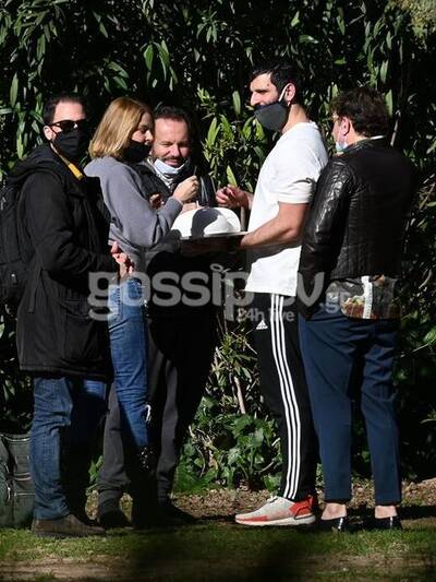 Η όμορφη παρουσιάστρια και σύζυγος του υπουργού Υγείας, είχε την ευκαιρία να συναντήσει τους φίλους της, ανάμεσά τους και ο γνωστός επικοινωνιολόγος, Κωνσταντίνος Καφίρης, ο οποίος εκείνη την ημέρα είχε και τα γενέθλιά του, φορώντας τις μάσκες προστασίας τους αποφεύγοντας τις αγκαλιές και τα φιλιά για τις ευχές.