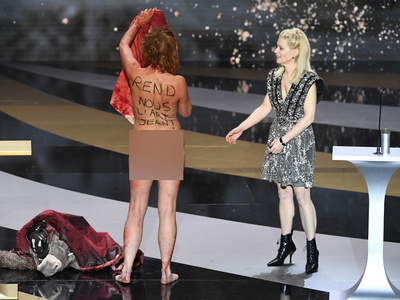 Γυμνή στη σκηνή, η Γαλλίδα ηθοποιός Κορίν Μαζιερό, είχε ένα μήνυμα να στείλει στον πρωθυπουργό Ζαν Καστέξ, κατά τη διάρκεια της τελετής για την απονομή των περίβλεπτων κινηματογραφικών βραβείων Σεζάρ: «Ζαν, δώσε μας πίσω την τέχνη», έγραφε το μήνυμα στην πλάτη της.