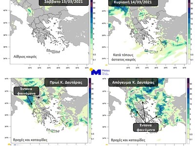 Σύμφωνα με τα προγνωστικά στοιχεία του Εθνικού Αστεροσκοπείου Αθηνών/meteo.gr, μεταβολή αναμένεται να παρουσιάσει ο καιρός από την Κυριακή 14/03 με βροχές και τοπικές καταιγίδες, ενώ την Καθαρά Δευτέρα πέραν του άστατου καιρού θα επικρατήσουν θυελλώδεις άνεμοι δυτικών διευθύνσεων, δημιουργώντας προβλήματα σε στεριά και θάλασσα.
