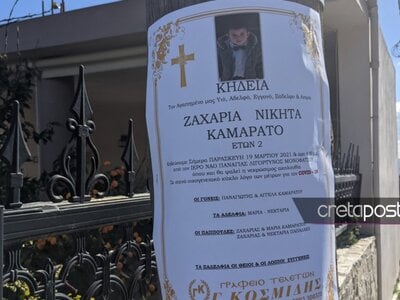 Η κηδεία του μικρού Ζαχαρία θα τελεστεί στις 4 το μεσημέρι στον ιερό Ναό Παναγιάς Λιγόρτυνος Μονοφατσίου