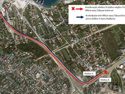 Στο πλαίσιο εκτέλεσης εργασιών συντήρησης στην περιοχή σύνδεσης του κόμβου Ρίου με τη Γέφυρα Ρίου-Αντιρρίου, από τις 08:00 το πρωί της Δευτέρας 22.03.2021 έως τις 15:00 το μεσημέρι της Τετάρτης 28.04.2021, θα πραγματοποιηθεί αποκλεισμός του κλάδου εξόδου του αυτοκινητόδρομου από Αθήνα προς Γέφυρα/Ιωάννινα (Β) και η κίνηση των οχημάτων θα εξυπηρετείται από τον κλάδο προς Ρίο/Πορθμείο και εν συνεχεία προς Γέφυρα Ιωάννινα (Α), όπως φαίνεται στο ακόλουθο σχηματικό διάγραμμα.