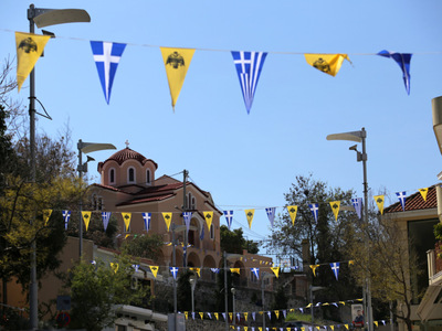 Η απορία μάλιστα εντείνεται από το γεγονός ότι ανάμεσα στα κλασικά ελληνικά σημαιάκια με τα οποία η Αγίου Νικολάου πανηγυρίζει τα 200 χρόνια από την έναρξη της επανάστασης (όπως και ο δρόμος προς την πλατεία Αγίου Γεωργίου) βρίσκονται και τα γνωστά κίτρινα με τον δικέφαλο του Βυζαντίου, τα οποία ευθύς αμέσως εξαιρούν τη δημοτική αρχή από τους «υπόπτους» για την τοποθέτησή τους και «δείχνουν» ως υπεύθυνη για το αισθητικό επετειακό αποτέλεσμα στις σκάλες και την περιοχή πέριξ αυτών την εκκλησία του Αγίου Νικολάου.
