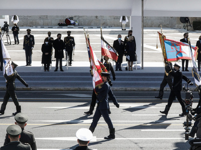 Τηρώντας τους υγειονομικούς κανόνες και τηρώντας τις απαραίτητες αποστάσεις, στην εξέδρα των επισήμων βρίσκονται, πέρα από την Πρόεδρο, τον πρωθυπουργό, τον αρχηγό της αξιωματικής αντιπολίτευσης και μέλη της κυβέρνησης, ο Πρόεδρος της Κύπρου Νίκος Αναστασιάδης, ο πρωθυπουργός της Ρωσίας Μιχαήλ Μισούστιν, ο διάδοχος του βρετανικού θρόνου πρίγκιπας Κάρολος με τη δούκισσα της Κορνουάλλης και η υπουργός Αμυνας της Γαλλίας Φλωράνς Παρλί. Το «παρών» δίνουν ακόμη ο περιφερειάρχης Αττικής Γιώργος Πατούλης, ο δήμαρχος Αθηναίων Κώστας Μπακογιάννης, κ.α.