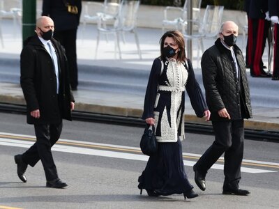 Το απόγευμα της Τετάρτης (24/3), η Γιάννα Αγγελοπούλου με τον σύζυγό της, Θεόδωρο, κατέφθασαν έξω από την ανακαινισμένη Εθνική Πινακοθήκη λίγα λεπτά αφότου ο πρωθυπουργός Κυριάκος Μητσοτάκης υποδέχθηκε τον Ρώσο πρωθυπουργό Μιχαήλ Μισούστιν, αλλά και τον πρίγκιπα Κάρολο. Με μπλε παντελόνα και γόβες στον ίδιο χρωματισμό, η πρόεδρος του «Ελλάδα 2021» επέλεξε ένα ιδιαίτερο λευκό πουκάμισο με όγκο στα μανίκια και παραδοσιακό αμάνικο επενδύτη.