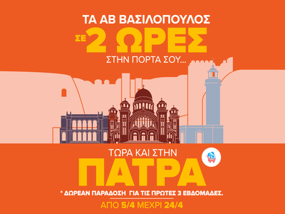 Τώρα, το super app και το supermarket, ενώνουν τις δυνάμεις τους και αναλαμβάνουν μια νέα αποστολή: να φέρουν για πρώτη φορά, και στην περιοχή της Πάτρας, τα ψώνια με την μοναδική ποιότητα και την ξεχωριστή ποικιλία της ΑΒ Βασιλόπουλος, στο σπίτι μας, μέσα σε δύο μόλις ώρες. Μια αποστολή που μας εξασφαλίζει: