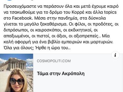 “Η δική μου περιπέτεια με τον Covid-19 τελείωσε μετά από ελαφρές αναταράξεις . Όχι όμως και για την υπόλοιπη οικογένεια που χειρίζεται μια ριψοκίνδυνη αναγκαστική προσγείωση .. Ανεβήκαμε στον ιερό βράχο της Ακρόπολης για θετική ενέργεια. Να προσέχετε , να φοράτε μάσκες και να μην ξεχνιέστε . Όλοι έχουμε κουραστεί και εκεί είναι που κάνουμε το λάθος. Μας έκλεισαν τα πάντα και κολλάμε ο ένας τον άλλον στα σπίτια . Πόσον καιρό να ζεις μακριά από φίλους ; Ίσως τα γράψω πιο αναλυτικά όταν όλα πάνε καλά. Θα παραμένω πάντα αισιόδοξη . Να προσέχετε πολύ! Δεν αστειεύεται αυτό το πράγμα – ούτε είναι απλή ίωση!! Ο ένας το περνάει στο πόδι και ο άλλος στο νοσοκομείο με βαριά πνευμονία ! Χωρίς υποκείμενα νοσήματα .. μην ακούτε τα «δεν έχω- έχω κάνει εκατό τεστ» και μακρυά από αρνητές και ανεύθυνους. Λάθος μας μεγάλο. Ένα τεράστιο ευχαριστώ στους γιατρούς και νοσηλευτές – αγωνίζονται την πιο δύσκολη περίοδο της ανθρωπότητας με όλα τα μέσα για να μας βοηθήσουν να πάρουμε πίσω τη ζωή μας, την καθημερινότητα μας. Ας παραμείνουμε αγαπημένοι και που θα πάει.. θα περάσει ΚΑΙ αυτό! Είναι πια θέμα χρόνου.. ”