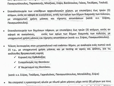 «Ο υπουργός Επικρατείας επισήμανε στα μέλη της επιτροπής ότι κρίνεται απαραίτητη η αναπροσαρμογή των εφαρμοσμένων μέτρων, ώστε να υπάρξει εκτόνωση των πολιτών και να επαναλειτουργήσουν δραστηριότητες που έχουν τη μικρότερη δυνατή επίπτωση στην επιδημιολογική εικόνα, η οποία εξακολουθεί να παραμένει κρίσιμη».