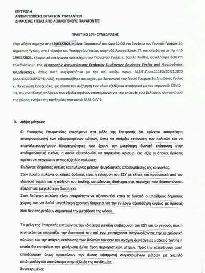 Στα πρακτικά της 176ης συνεδρίασης της Επιτροπής Αντιμετώπισης Εκτάκτων Συμβάντων από Λοιμογόνους Παράγοντες, της 19ης Μαρτίου 2021, ο υπουργός Επικρατείας Γιώργος Γεραπετρίτης ουσιαστικά δίνει την κατεύθυνση στην οποία πρέπει να κινηθούν οι εισηγήσεις των επιστημόνων και οι ανακοινώσεις τους: