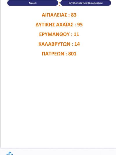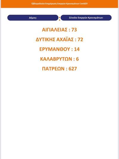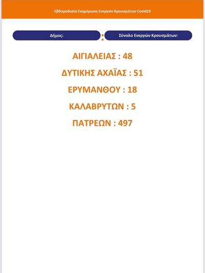 "Ένα μήνα τώρα προσέξτε την σταδιακή αποκλιμάκωση των ενεργών κρουσμάτων, στην περιφερειακή μας ενότητα. Ας κρατήσουμε το αποτέλεσμα , από τα 881 ενεργά κρούσματα στην Πάτρα , φτάσαμε στα 497 , στο χέρι μας είναι να δείξουμε την ανάλογη προσοχή", αναφέρει, παραθέτοντας τους σχετικούς πίνακες.
