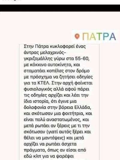 Καταγγελία για έναν άνδρα που κυκλοφορεί στην Πάτρα και σταματά κοπέλες κάνοντας περίεργες ερωτήσεις, έγινε μέσω διαδικτύου ( facebook). Όπως αναφέρει η καταγγελία, "στην Πάτρα κυκλοφορεί ένας άνδρας μελαγχρινός- γκριζομάλλης γύρω στα 55- 60 με κόκκινο αυτοκίνητο και σταματάει κοπέλες στον δρόμο, με πρόσχημα να ζητήσει οδηγίες για τα ΚΤΕΛ. Στην αρχή φαίνεται φυσιολογικός αλλά αφού πάρει τις οδηγίες, αρχίζει και λέει την ίδια ιστορία,ότι έγινε μια δολοφονία στη Βόρεια Ελλάδα και σκότωσαν μια φοιτήτρια και είναι πολύ αναστατωμένος και μετά ρωτάει με τι τη σκότωσαν (γιατί αυτός ξέρει και θέλει να μαντέψεις) και μετά αρχίζει να ρωτάει άσχετα πράγματα, όπως αν είσαι από δω κλπ, για να ψαρέψει προφανώς πληροφορίες. Αυτό συνέβη σε 2 διαφορετικές κοπέλες μέχρι στιγμής". Καταγγέλεται επίσης ότι "υπήρχαν και περιστατικά με διαφορετικό αμάξι, αλλά και χωρίς αμάξι με το ίδιο σύστημα".