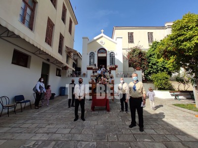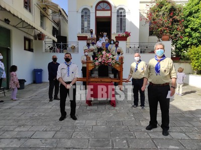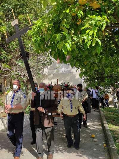 Με κατάνυξη έγινε το μεσημέρι της Μ. Παρασκευής από τους Προσκόπους η περιφορά του Επιταφίου στο εκκλησάκι του Άγιου Χαράλαμπου, μέσα στο αίθριο του Παλαιού Νοσοκομείου.